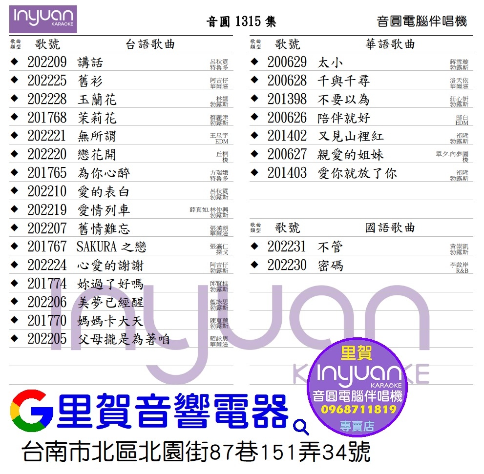 音圓伴唱機111年5月歌單1306集 音圓伴唱機 台南市經銷據點 里賀音響電器