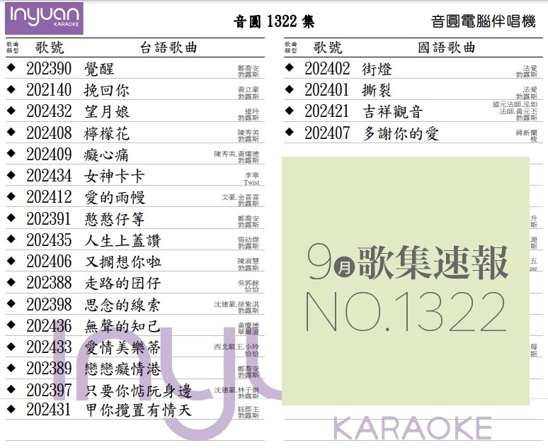 音圓伴唱機112年2月歌單1315集已發行含25首midi歌曲里賀音響電器