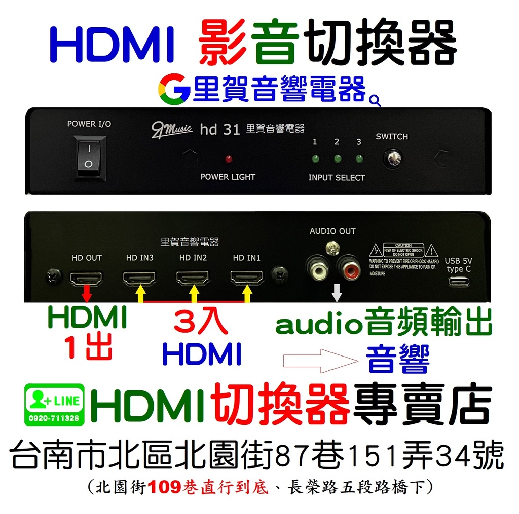 HDMI 影音切換器3 HDMI入1 HDMI出 ﹢audio音頻輸出~~音響找里賀音響電器