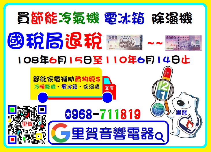 購買冷氣機 電冰箱 除濕機 能源效率1級或2級 國稅局每台減徵稅額以$2,000為限 找里賀電器