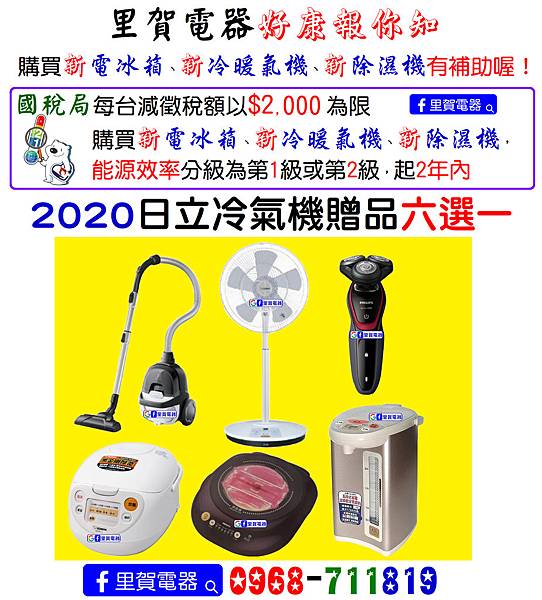 里賀電器 109年 購買日立 冷氣機 贈品六選一 再減徵稅2,000元