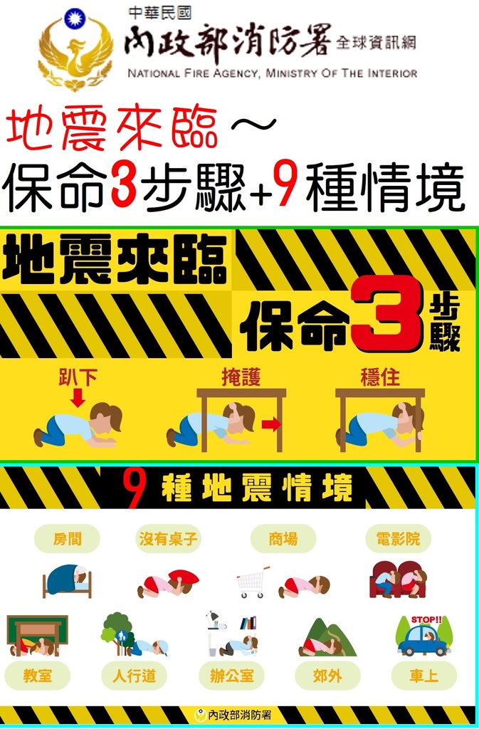 地震來臨~保命3步驟+9種情境 內政部消防署