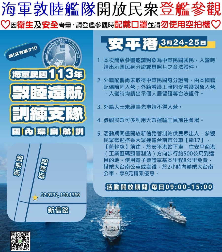 海軍敦睦艦隊國內環島航訓開放民眾登艦參觀安平港:113年3月24、25日(星期日、一)上午9:00至下午15:00時。海軍艦隊指揮部表示,歡迎全國民眾與學子踴躍參觀,共同享受一場難忘的國防饗宴,並請攜帶中華民國國民身分證或可證明國民身分之具照片證件,配合開放時程及現場引導,提早入場,以免向隅。海軍艦隊指揮部今日表示,海軍民國113年敦睦遠航訓練支隊計納編油彈補給艦磐石艦、康定級飛彈巡防艦迪化艦及成功級飛彈巡防艦成功艦等3艘艦艇,將靠泊各港口開放民眾蒞臨參觀,並招募有志青年共同加入海軍的行列。